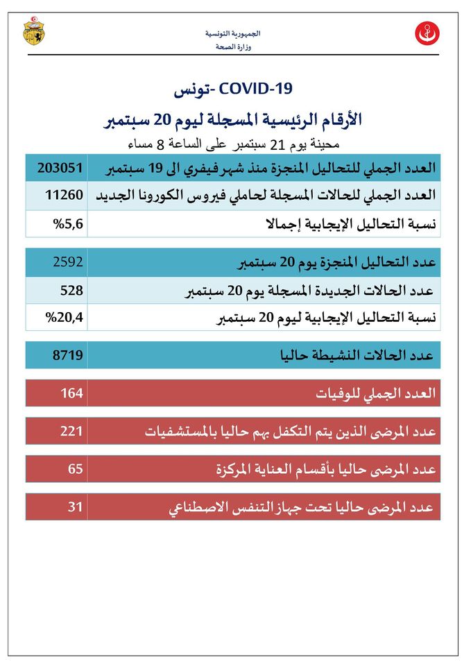 أعلنت وزارة الصحة أنه بتاريخ 20 سبتمبر 2020، تم تسجيل 528 حالة إصابة جديدة بكورونا وارتفاع عدد الوَفيات إلى 164. وقد بلغ العدد الجملي للإصابات بكورونا منذ بداية الجائحة 11260 إصابة.