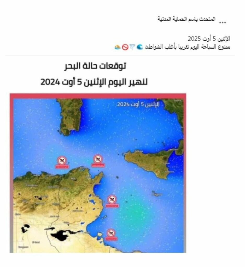 نشر المتحدث باسم الحماية المدنية على صفحته الرسمة على الفايسبوك تدوينة، اليوم الإثنين 5 أوت 2024، حذر من خلالها من السباحة في أغلب الشواطئ التونسية.