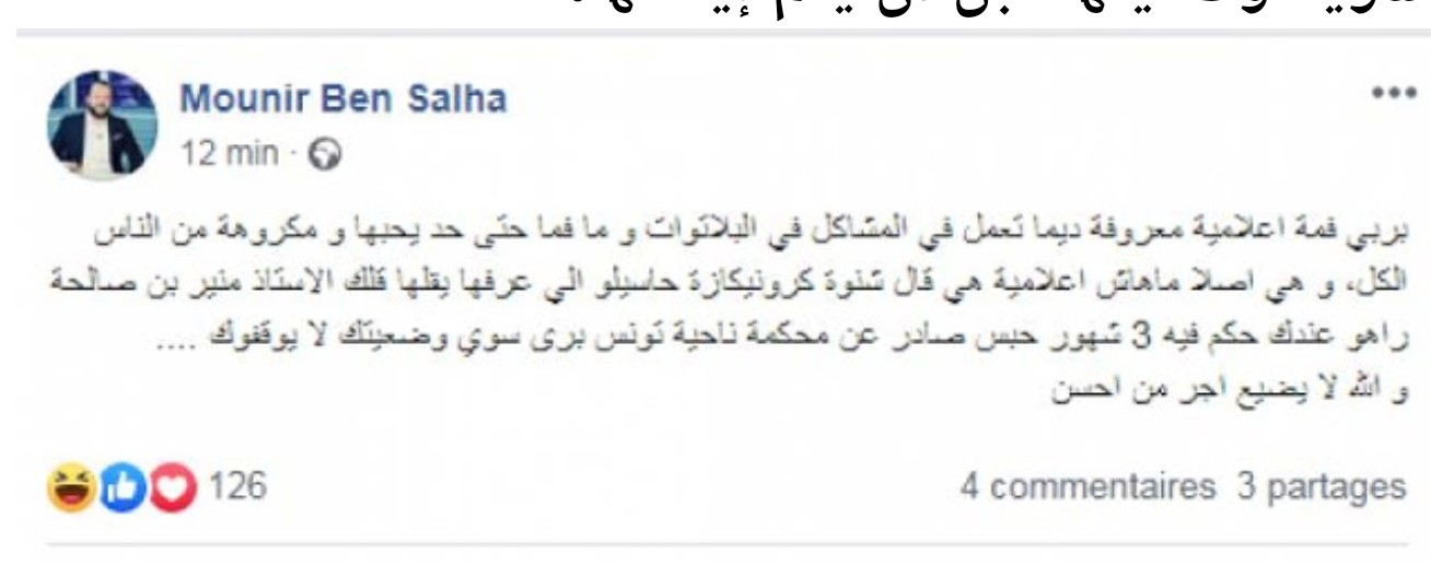 ودعا منير بن صالحة، من خلال تدوينة نشرها عبر صفحته على موقع التواصل الاجتماعي “فايسبوك”، بية الزردي، إلى تسوية وضعيّتها قبل أن يتمّ إيقافها.