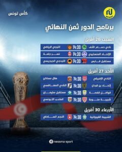 إليك برنامج مباريات الدور ثمن النهائي لكأس تونس مع القنوات الناقلة والحكام قابل للنسخ: