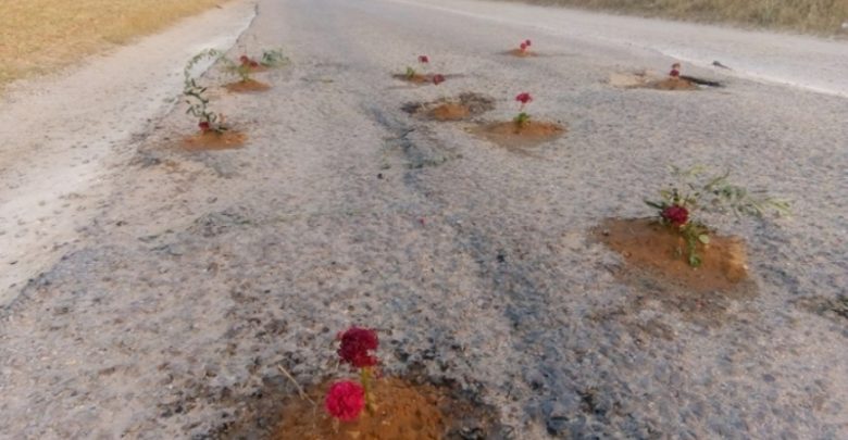 وغرس المواطنون الورود في حفر وسط الطريق للتعبير عن استيائهم من تأخر إنجاز مشروع إعادة تعبيده.
