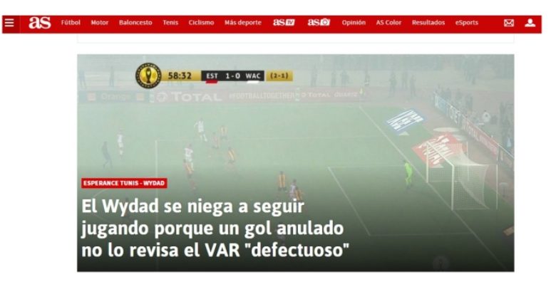 صحيفة الآس الإسبانية لم تتحدث عن تتويج الترجي و فضلت الآتي : الواداد يرفض مواصلة لعب الدور النهائي بسبب إلغاء هدفه و غياب تقنية الفيديو ” المعطل “