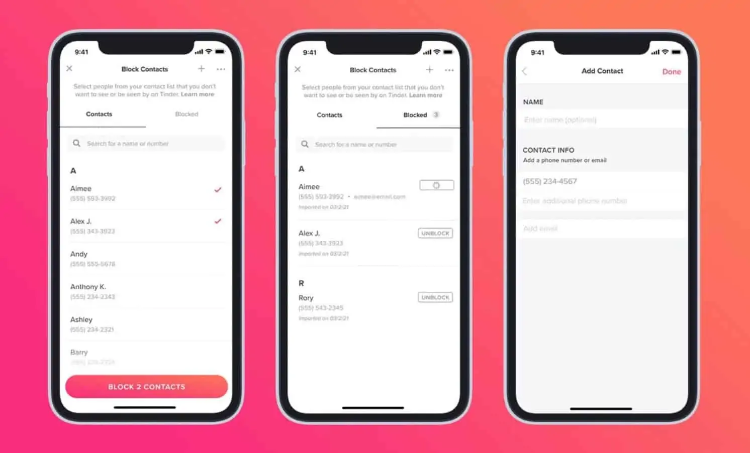 Selon le communiqué de Tinder, “s’ils en avaient la possibilité, 78 % des sondés préfèreraient ne pas voir ces contacts dans l’application, ni être vus par ceux-ci. Avec cela à l’esprit, Tinder déploie une nouvelle fonctionnalité permettant aux membres de bloquer des contacts dans l’application, leur offrant ainsi la possibilité de faire des rencontres tout en évitant la gêne de trouver des visages familiers qu’ils préfèreraient ne pas voir.”