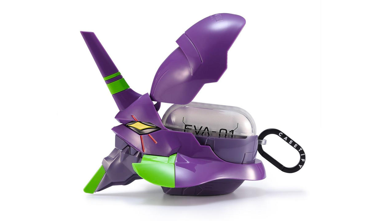 La pièce la plus emblématique de cette série est très certainement l’étui en édition limitée pour AirPods Pro basé sur le Unit-01 d’Evangelion, transformant votre étui pour écouteurs Apple en une tête de mecha violet. S’il semble trop imposant pour être rangé dans une poche, Castify explique qu’il a été pensé et conçu “comme ornementation et non pour subir des impacts, éraflures et autres activités brusques”. Autrement dit, il est fait pour rester tranquillement posé sur un bureau, à la vue de tous, et non comme une protection au quotidien.