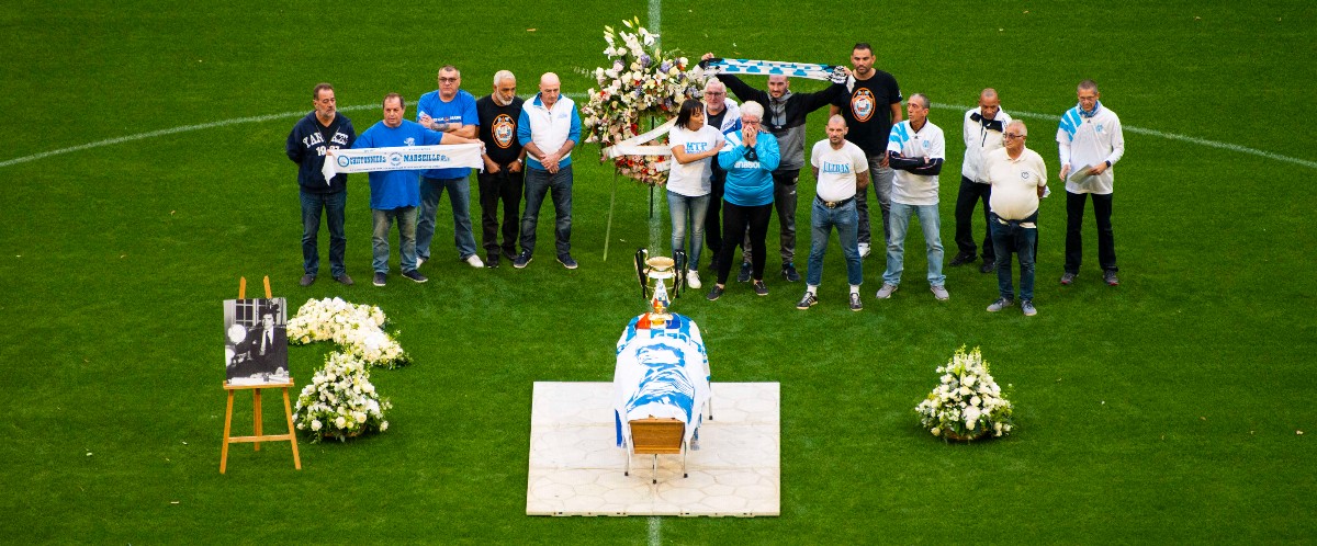 Décoré d’écharpes olympiennes, le cercueil abritant l’ancien patron légendaire du club marseillais (1986-1994), a été porté par des membres de six associations des supporters de l’OM, sous les yeux de Stéphane Tapie, un de ses enfants.